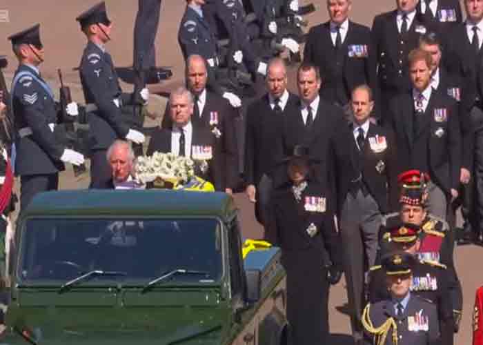 Los cuatro hijos y varios de los nietos de la pareja real acompañaron a pie hasta allí al Land Rover especialmente diseñado por Felipe para llevar su féretro durante un breve cortejo fúnebre por los jardines del castillo.