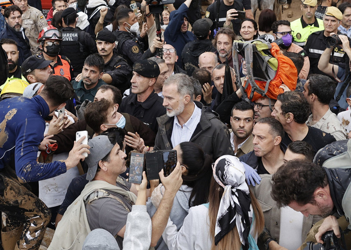 Los gritos de «¿Dónde está Pedro Sánchez?» y «Pedro Sánchez, hijo de puta» resonaban entre la multitud. El rey de España intentó calmar los ánimos dialogando con algunos jóvenes, pero fue en vano. Ante el aumento de la violencia, un cordón de agentes, algunos montados a caballo, protegió al monarca, quien finalmente recibió escolta hacia su vehículo. Las autoridades decidieron suspender la visita, al igual que toda la agenda prevista en Valencia para ese día.
