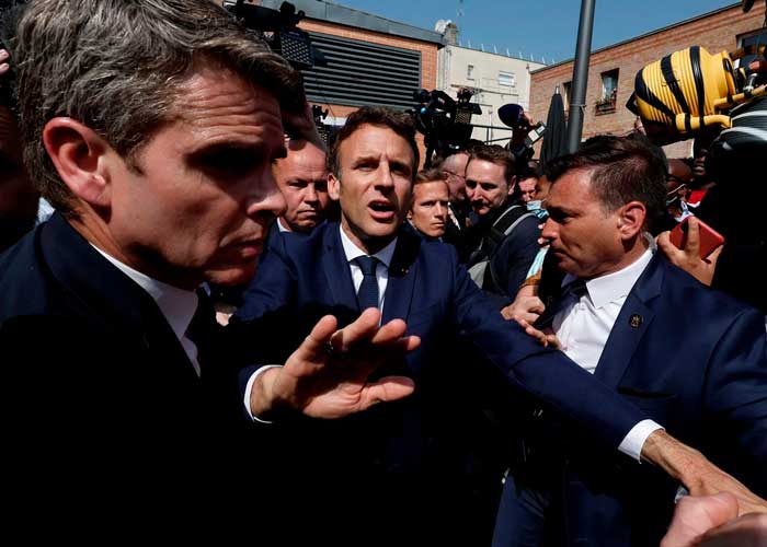 Macron no habló sobre el incidente en unas declaraciones a los medios, en las que se podía ver a los miembros de su servicio de seguridad un poco nerviosos. En ese momento se encontraban entre la muchedumbre que quería plantear quejas o preguntas, o simplemente saludar al presidente.