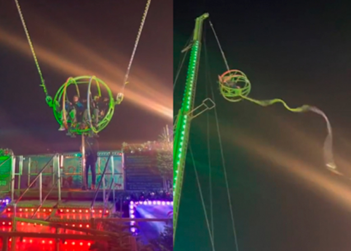 A través de un breve video viral en redes sociales muestra el momento exacto en que una cuerda de un juego de feria se rompe, dejando a dos adolescentes suspendidos en el aire, mientras varios de los asistentes entraron en pánico.