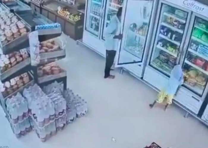 En el momento, se fue hacia atrás y quedó colgada sin que su mano soltara la manija y luego de tomar un producto; el sujeto ve lo que pasó y carga a la niña para salir corriendo.