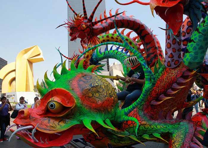 Entre el Monumento al Ángel de Independencia y el Zócalo de la Ciudad de México desfilaron criaturas fantásticas como diablos, aves con colmillos, peces, armadillos y un dinosaurio.