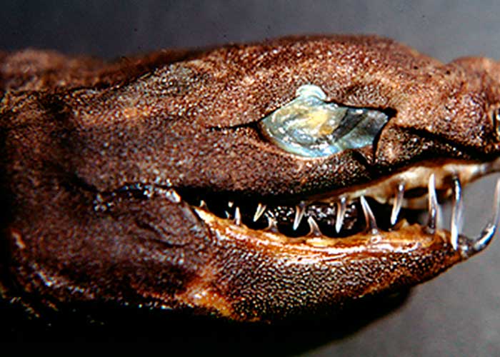 Una de las características típicas de estos tiburones son los dientes en forma de aguja, que se asemejan a los colmillos de las víboras. Sus mandíbulas son extensibles y pueden atrapar a su presa, por lo que recuerdan inevitablemente a los protagonistas extraterrestres de la famosa película de miedo de Ridley Scott, 'Alien'.