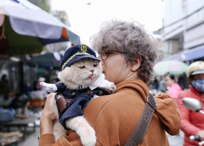 Además de por lo atípico de su nombre, otra razón por la que ha causa furor entre clientes y vendedores radica en sus llamativas y tradicionales vestimentas. También suele lucir un sombrero y unas gafas que le otorgan una aspecto de lo más singular. El felino, de tres años, se volvió famoso en las redes sociales después de que su dueño, Le Quoc Phong, subiera sus fotografías en su página de Facebook.