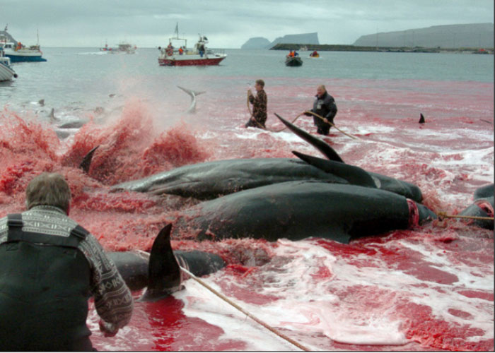 Los habitantes de las islas Feroe, ubicadas en el Atlántico Norte, realizan cada verano el denominado 'Grindadráp', donde cientos de ballenas piloto y delfines son dirigidos a las playas para ser acuchillados y arponeados.