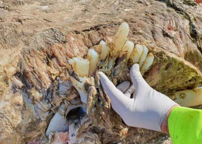 Los restos de una enorme criatura marina en avanzado estado de descomposición y con la cabeza ya desintegrada fueron arrojados la semana pasada por el mar en una playa de la localidad de Broad Haven (Gales, Reino Unido).
