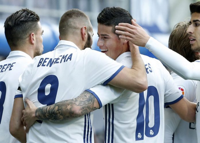 Karim Benzema brilló con un doblete y una asistencia, el colombiano James Rodríguez le siguió la estela con un tanto y participación en los otros tres goles, y el Real Madrid se paseó sin problemas el sábado en cancha del Eibar, donde cosechó un triunfo por 4-1 que le deja de nuevo en todo lo alto de la liga española.
