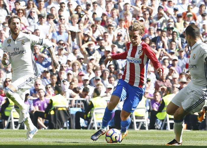 Antoine Griezmann anotó a cinco minutos del final y el Atlético de Madrid le robó el sábado un empate 1-1 al Real Madrid, un resultado que abre la puerta para que el Barcelona desplace al equipo merengue de la cima de la liga española.