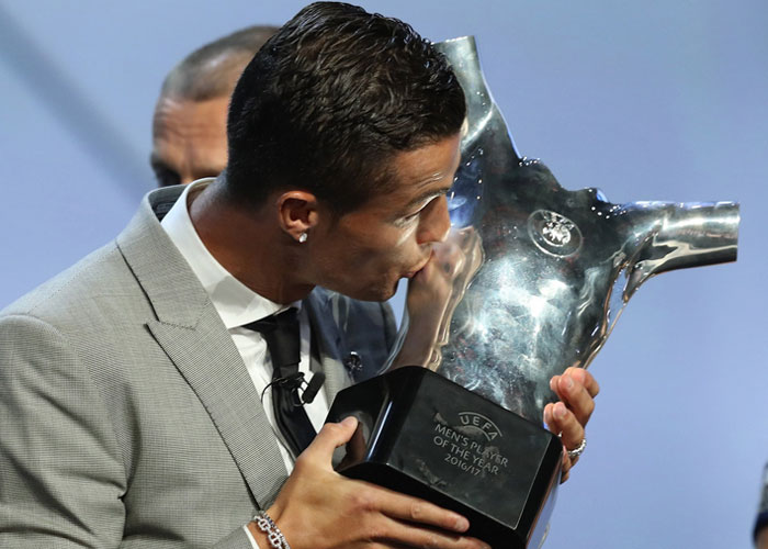 El presidente de la UEFA, Aleksander Ceferin, anunció el nombre de Crstiano como ganador de un premio que el portugués besó en dos ocasiones y que consideró "un honor recoger otra vez" como el año pasado y que también pertenece sus compañeros.