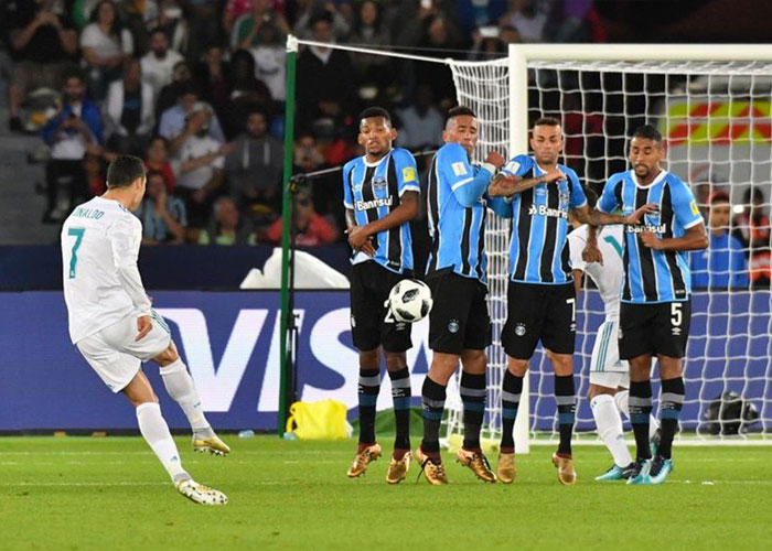 Un tanto de falta de Cristiano Ronaldo a los 53 minutos tumbó el planteamiento del Gremio brasileño y dio al Real Madrid su tercer Mundial de Clubes, igualando al Barcelona como equipo más laureado del torneo.