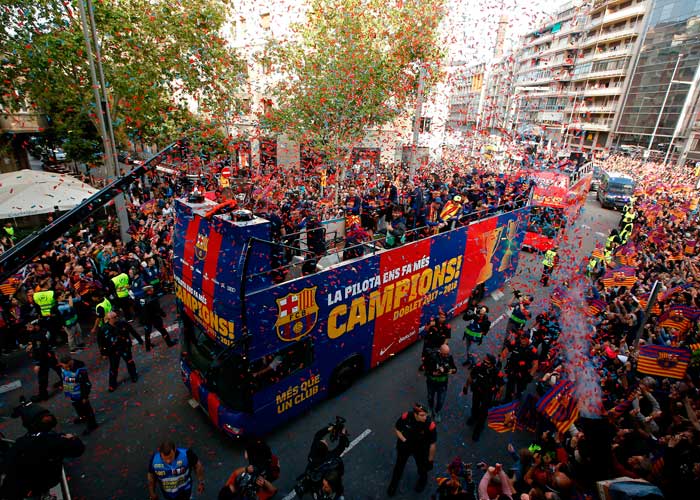 El Barcelona festejó sus títulos de la Liga Española y la Copa del Rey con un desfile por las calles de la ciudad el lunes.