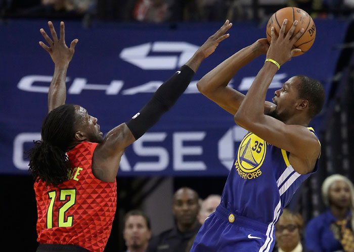 Kevin Durant anotó 29 puntos, incluyendo una canasta clave en el último minuto, un día después de que un incidente con gritos en la banca con Draymond Green llevase a la suspensión de su compañero por un partido, y unos Warriors de Golden State plagados de bajas aguantaron el martes para derrotar 110-103 a los Hawks de Atlanta.