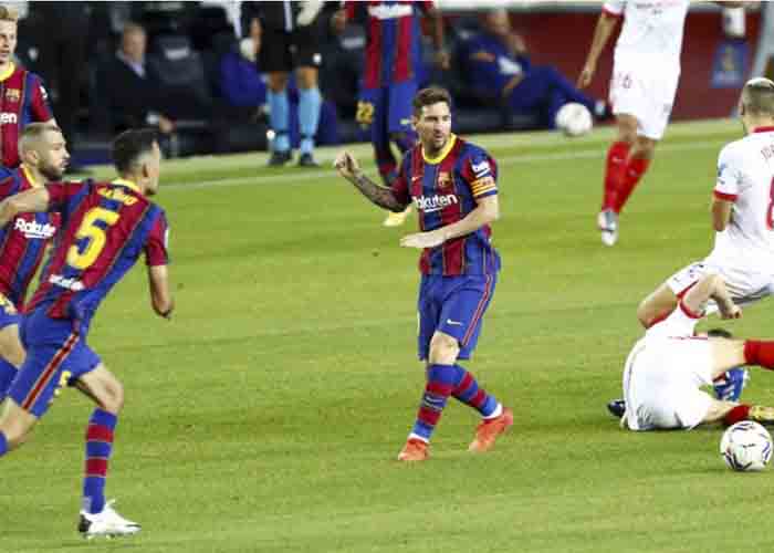 La defensa del Sevilla pobló el mediocampo durante el resto de la pulsea, con la dupla del volante de contención Fernando y el central Jules Kounde desactivando el circuito Messi-Coutinho, así como las incursiones de Ansu Fati por la izquierda.