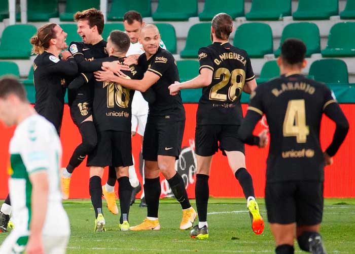 El Barcelona dominó por 2-0 en el terreno del ascendido Elche, en zona de descenso (19º), este domingo en la 20ª jornada de la Liga española, subiendo a la tercera plaza por delante del Sevilla (4º) y a siete puntos del líder Atlético, que juega contra el Valencia (14º).