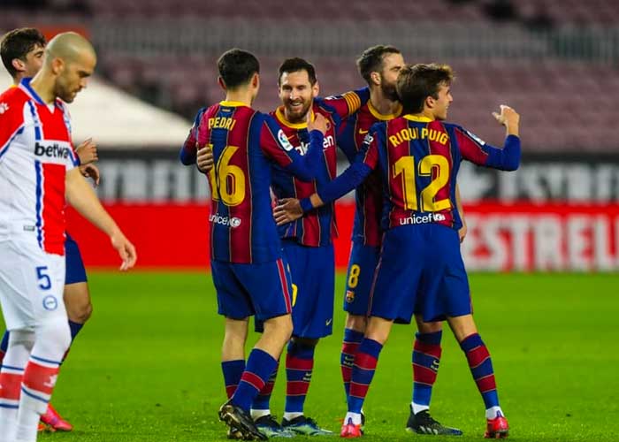 El portugués Francisco Trincão también celebró un doblete con dianas a los 29 y 75, mientras que el hispano-dominicano Júnior Firpo selló la goleada en una soberbia jugada que nació en los botines de Messi, con un grandioso pase bombeado a la llegada de Griezmann, quien sacó un centro rasante para que el lateral lo empujara a las redes a los 80.