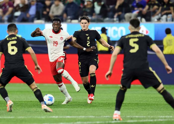 El zaguero canadiense Alphonso Davies pugna el balón en medio de los jugadores mexicanos Erik Lira (izquierda) e Israel Reyes (segundo a la derecha) durante la semifinal de la Liga de Naciones de la CONCACAF, el jueves 20 de marzo de 2025, en Inglewood, California. (AP Foto/Etienne Laurent)