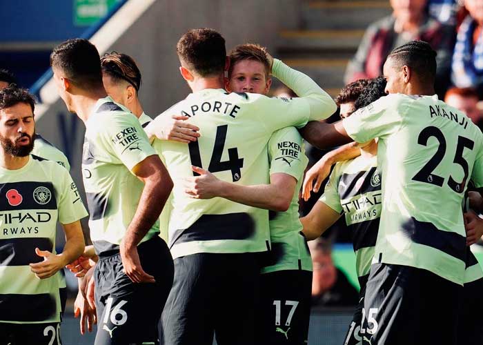 Un tiro libre perfecto de Kevin de Bruyne le bastó al Manchester City para superar la ausencia de Erling Haaland y llegar momentáneamente al tope de las posiciones en la Liga Premier al vencer como visitante al Leicester 1-0 el sábado.
