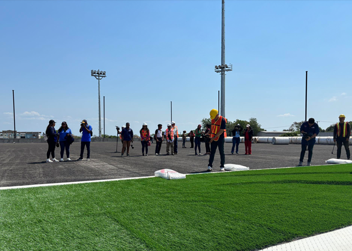 Este escenario deportivo comenzó precisamente con esta visita de los medios de comunicación la instalación de la grama sintética. Ya es visible la grada lateral que presentará un aforo de 2,000 personas.