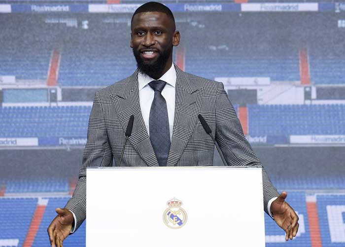 Rüdiger, que ya pasó el reconocimiento médico y firmó su nuevo contrato, fue presentado en un acto presidido por el presidente del club madridista, Florentino Pérez.