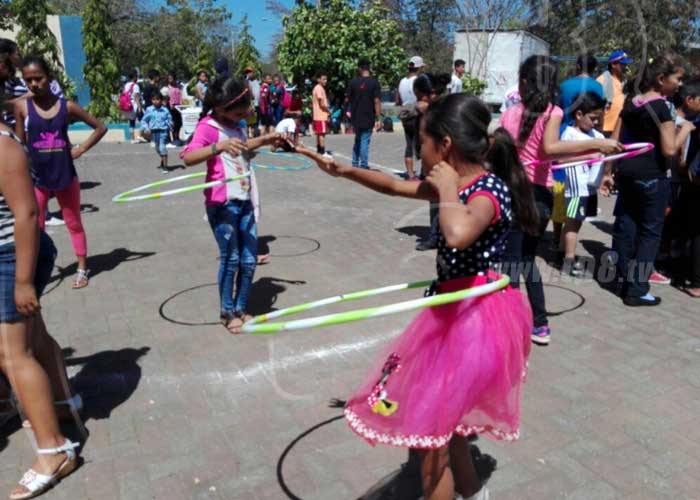 Más de mil niños de los 7 distritos de Managua rinden homenaje con bailes culturales, brincas brincas, concursos de ula, ula, además de quebrar piñatas.
