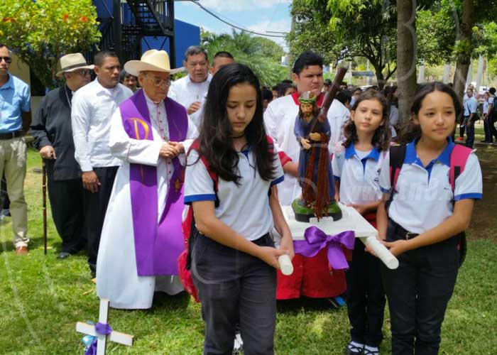 En el tercer viernes de cuaresma, la comunidad estudiantil de la Universidad Católica de Nicaragua y pobladores de zonas aledañas a esta casa de estudios superiores junto al prócer de la paz y la reconciliación, el Cardenal Miguel Obando y Bravo participaron en el viacrucis.