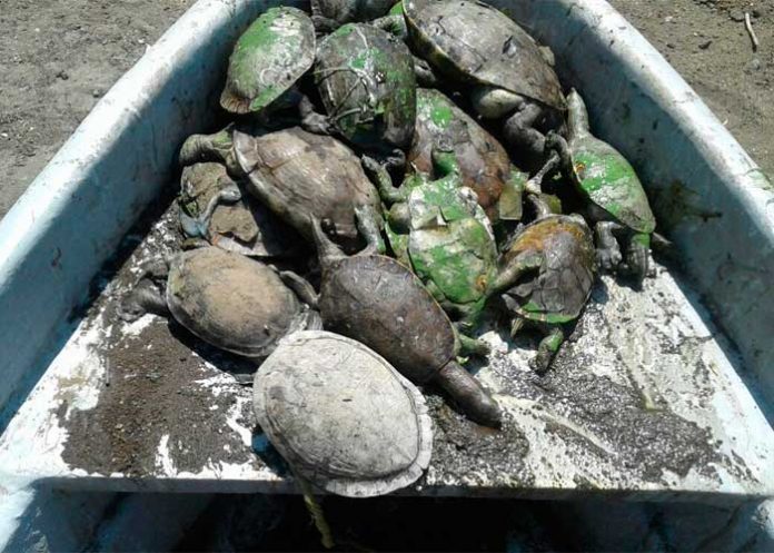 Tan solo el día de hoy mientras brigadistas del Ejército, Alcaldía, estudiantes del Loyola y personal de FONARE limpiaban la laguna, encontraron flotando en la ladera a 36 tortugas muertas adultas y jóvenes.