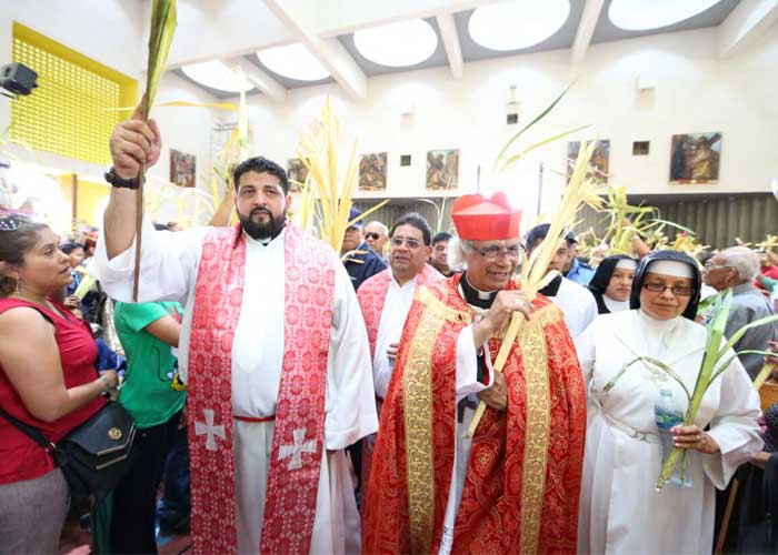 Antes de oficiar la misa el líder católico nicaragüense participó en una procesión y luego bendijo las palmas que portaban los asistentes como símbolo del recibimiento que se le dio a Jesús hace más de dos mil años que entró montado en una burrita a la ciudad de Jerusalén.