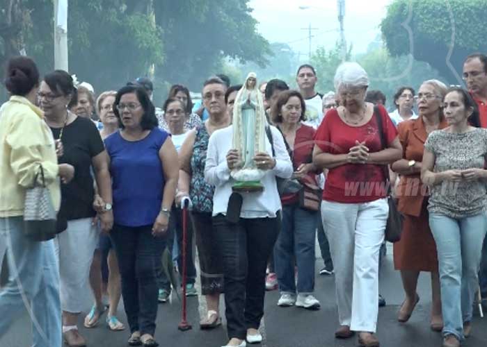 El sol aún no aparecía cuando ya la Imagen de la Virgen de Fátima recorría las calles aledañas a la Parroquia que lleva su mismo nombre en la Colonia Centroamérica, distrito V de Managua, Nicaragua, desde las cinco de la mañana un grupo de feligreses cargaron una réplica pequeña y al son de chicheros caminaron en los alrededores.