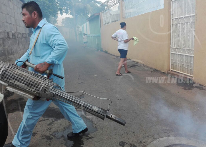 La población de la Colonia Managua, en el Distrito Dos, salieron a las calles para colaborar con los brigadistas de salud que continúan el proceso de fumigación en todo el territorio nacional, sin tregua al zancudo transmisor del Dengue, Zika y Chikungunya.