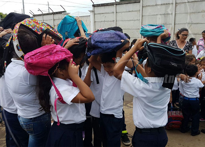 A las nueve en punto de la mañana, el timbre del colegio Luis Alfonso Velásquez, ubicado en la Colonia Máximo Jérez, en Managua, se activó indicando una emergencia. Inmediatamente, la mayoría de los estudiantes que ya están claros de las rutas de evacuación, salieron de sus aulas en forma ordenada para concentrarse en la ruta de seguridad.