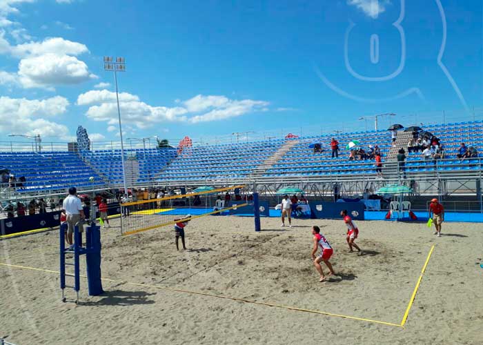 Se colocaron butacas para 1,500 espectadores, y la cancha llena todos los requisitos aprobada por la federación Internacional de voleibol Playa, tiene su cancha de calentamientos igual que las piscinas olímpicas tiene al lado sus piscinas de calentamientos.