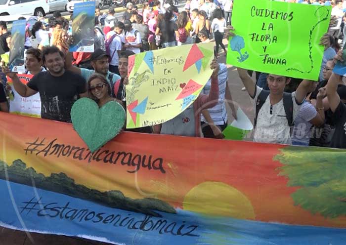 Grupos musicales animaban el ambiente, donde los presentes mostraban pancartas con mensajes como "CUIDEMOS A LA NATURALEZA", "ESTAMOS EN INDIO MAÍZ", "CUIDEMOS LA FLORA Y FAUNA", entre otros, que expresaban mucho amor y apoyo ante esta situación que se está registrando en esta zona del territorio nicaragüense.