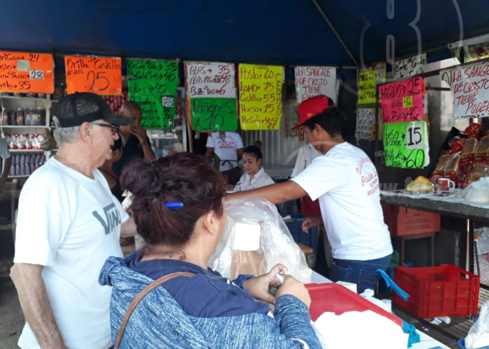 "a 32 (córdoba) el medio pollo, 36 la pechuga, 27 la pierna, pechuga especial 40 que está en promoción, el conito está a 33. La cajilla de huevo ahorita la tenemos a 70 y 80; 22 córdoba el salchichón, el choricito 26, mortadela 45 la libra y 28 la media libra", expresó Carlos Baltodano.