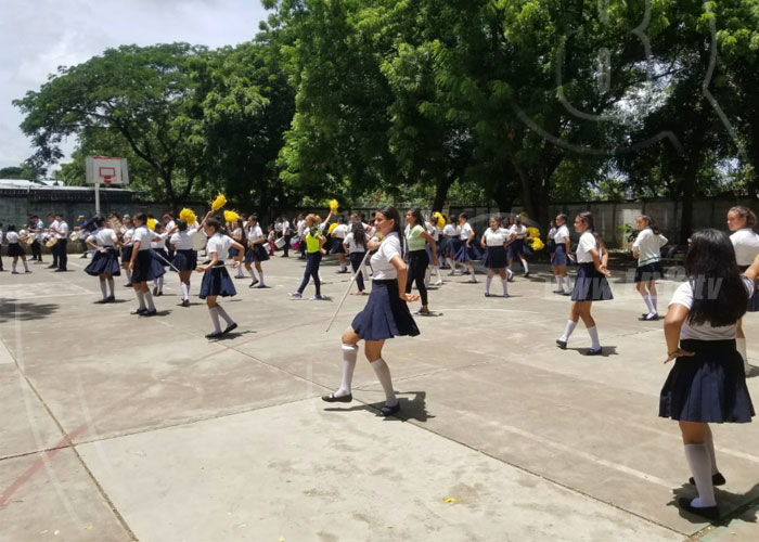 Estudiantes que conforman la gimnasia y banda rítmica del Instituto Enrique Flores, ubicado en Managua, al son de la música nacional expresan su amor patriótico y hacen tributo a los héroes nacionales que participaron en las gestas históricas de la batalla de San Jacinto e Independencia de Centroamérica.