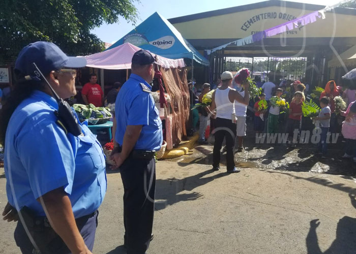La Policía Nacional este día también trabaja en función de la seguridad, en lo externo e interno de los cementerios.