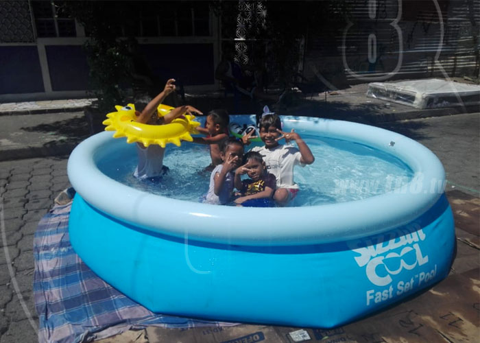 En la comodidad de sus hogares miles de familias capitalinas disfrutaron este Jueves Santo la temporada de verano dándose un refrescante chapuzón en las ya populares piscinas inflables instaladas en las calles, el porche o el patio de sus casas.
