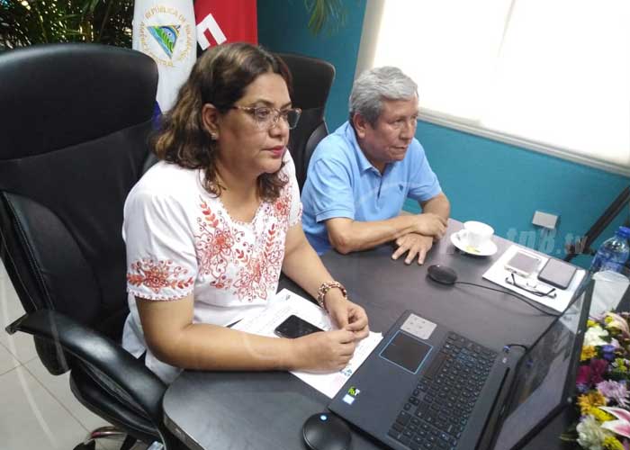 Mediante una video conferencia, la directora del INIFOM, Guiomar Irías y el ministro codirector del SINAPRED, Dr. Guillermo González