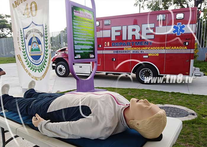 En saludo al 40 aniversario de fundación del Ministerio de Gobernación, miembros de la dirección general de bomberos realizaron un simulacro demostrativo de primeros auxilios en el parque Luis Alfonso Velásquez. El fin es que la población nicaragüense se interese por estas técnicas de primera respuesta y de ocurrir alguna emergencia brinden una solución ágil y eficaz. Entre las principales técnicas están como ayudar a una mujer embarazada si esta a punto de dar a luz y brindar resucitación cardiopulmonar en caso de que la respiración o los latidos cardíacos de alguna persona haya cesado.