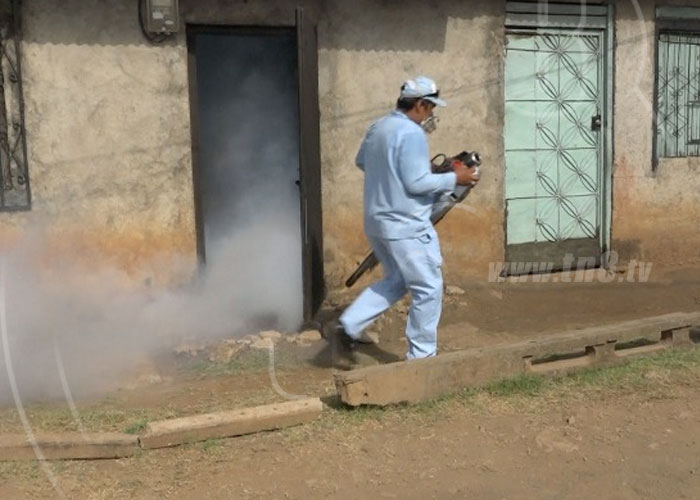 Trabajadores del Sistema Local de Atención Integral de Salud (SILAIS) fumigaron 1 mil 550 viviendas en el barrio Villa Reconciliación Sur, del Distrito Vl de Managua.