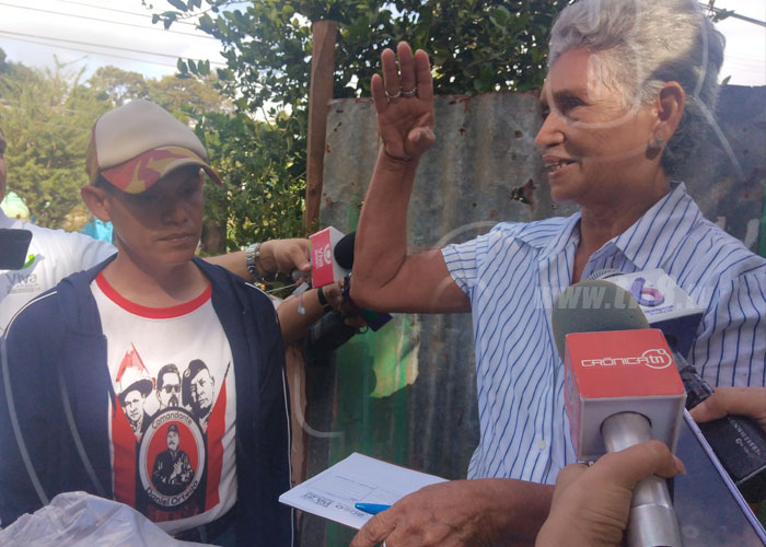 "Al comandante (Daniel Ortega) y la compañera Rosario (Murillo) le agradecemos mucho por preocuparse por nosotros que necesitamos de esta ayuda. Nuestros hijos cayeron en la guerra, mi hijo por lo menos toda Nicaragua es su tumba. Tengo mucho de recibir de este beneficio, que Dios les dé fortaleza a ella y a él para que sigan adelante y para que nos sigan ayudando", dijo Josefa Jiménez, quien recibió su paquete.