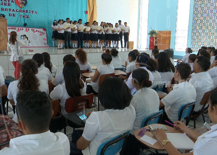 La escuela normal Alesio Blandón realizó un acto cultural en conmemoración del Día de la Mujer, con una cantata bajo el lema "Protagonistas Mujer de Paz", resaltando el valor que tiene la mujer nicaragüense desde el hogar, el trabajo y la comunidad en cada uno de los espacios y desde el modelo educativo.