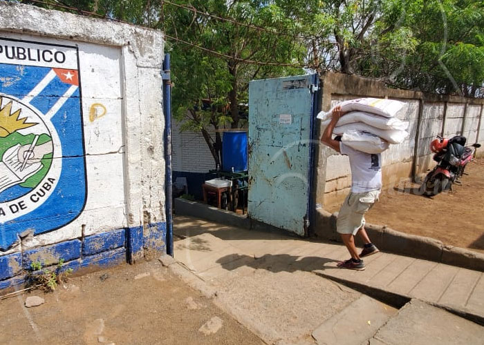 Trabajadores descargaron arroz, frijoles, aceite y cereal a las bodegas del colegio República de Cuba, que se ubica en Loma Linda.