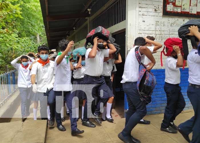 Este miércoles se realizó un simulacro de primeros auxilios, extinción de incendios y evacuación de personas en el Colegio Salvador Mendieta de Managua, con la finalidad de que los jóvenes adquieran habilidades y destrezas ante situaciones de riesgo en su entorno.