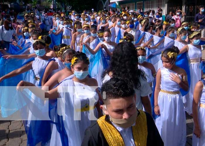 Al son de las bandas rítmicas y bailes de las palillonas, estudiantes del Colegio Rigoberto López Pérez del distrito I, al igual que del Colegio Filemón Rivera del Distrito V de Managua desfilaron en conmemoración al Bicentenario de Centroamérica y a la Batalla de San Jacinto.
