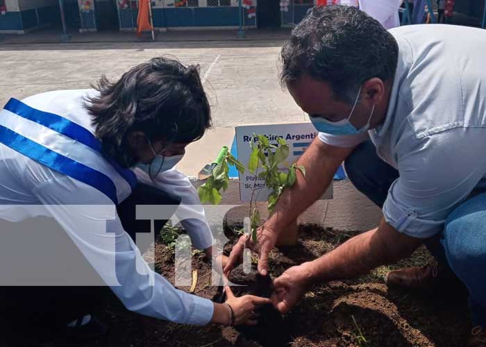 La comunidad educativa del colegio público República de Argentina, desarrolló este jueves una jornada de siembra de árboles que contó con la presencia del embajador de Argentina en Nicaragua, Mateo Daniel Capitanich.