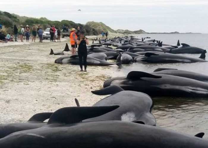 Unas 700 ballenas murieron al quedar varadas en Farewell Spit, en el extremo norte de la isla del Sur. Este cordón litoral de más de 26 km, que cierra por el norte Golden Bay, atrapa por razones desconocidas a los animales al perturbar su capacidad de navegación.