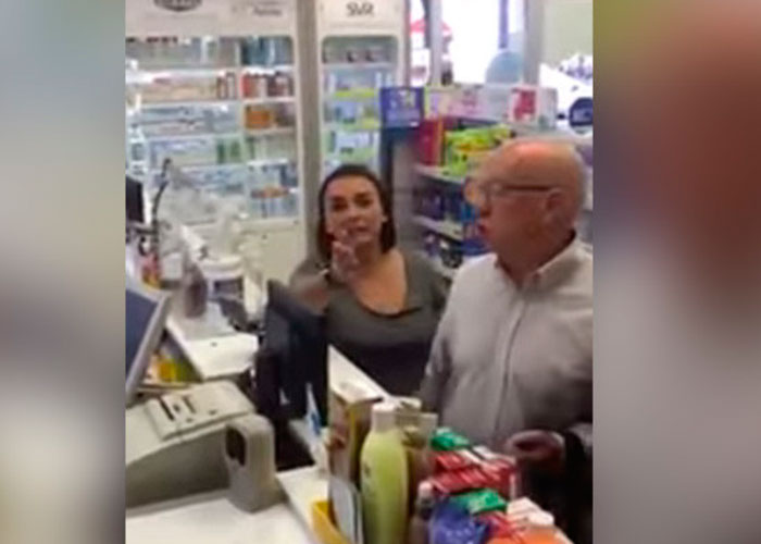 En el clip grabado por las dependientes de una farmacia se ve a dos personas que hacen escándalo por ser atendidos por extranjeros.