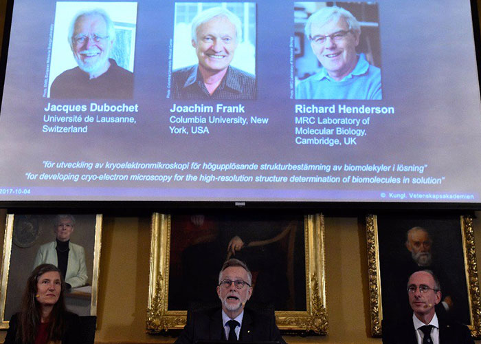 Jacques Dubochet, de la Universidad de Lausana; Joachim Frank de la Universidad de Columbia, en Nueva York, y Richard Henderson del Laboratorio de Biología Molecular MRC en Cambridge, Gran Bretaña, compartirán el premio de 9 millones de coronas (1,1 millones de dólares).