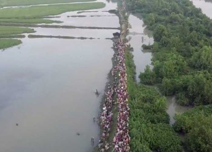 El video tomado el lunes por ACNUR muestra a miles y miles de personas avanzando por una estrecha franja de tierra junto a lo que parece un arroyo crecido en la zona de Palong Khali, en el sur de Bangladesh. La fila de refugiados en el video se extiende unos pocos kilómetros.