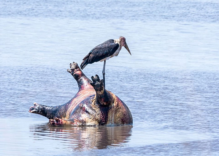 En una exhibición de la naturaleza en su forma más cruel, se capturaron cigüeñas desarticulando los cadáveres de los animales gigantes que flotaban a lo largo de la orilla del río.